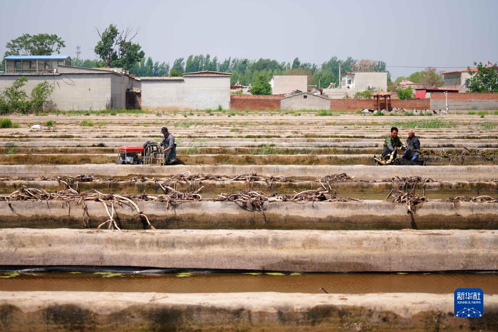 4月27日,在河北邢臺經(jīng)濟開(kāi)發(fā)區九家鋪村清水藕基地,農民在采挖藕苗。