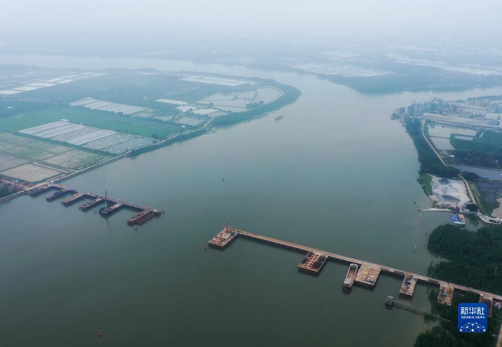建設中的潭江特大橋橫跨700米江面(4月27日攝,無(wú)人機照片)。