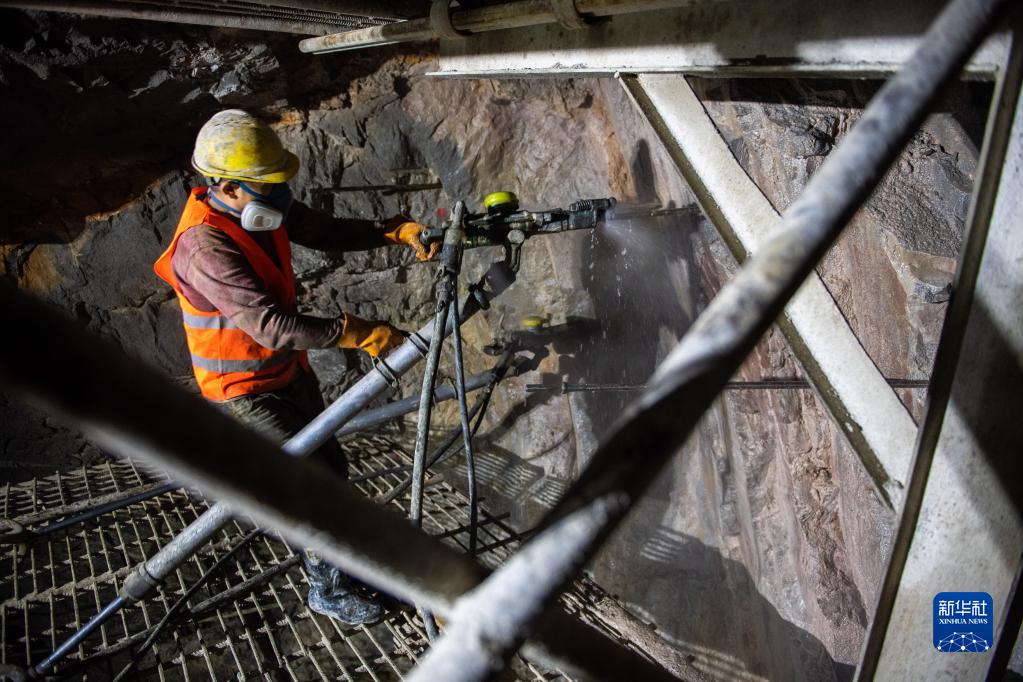 4月27日,在湖南桑龍高速賀龍隧道,工人做爆破施工前的準備工作。