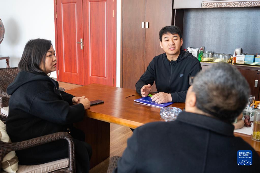 4月26日,宮照旭(中)和妻子張娟(左)在公司辦公室內和合作方工作人員洽談。