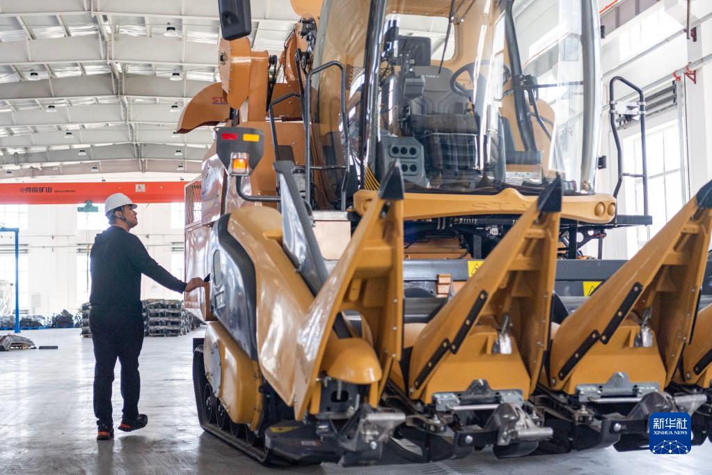 4月26日,宮照旭在公司生產(chǎn)車(chē)間內查看其自主研發(fā)生產(chǎn)的全地形履帶式玉米收割機。