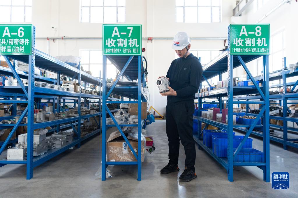 4月26日,宮照旭在公司生產(chǎn)車(chē)間內查看農機配件。