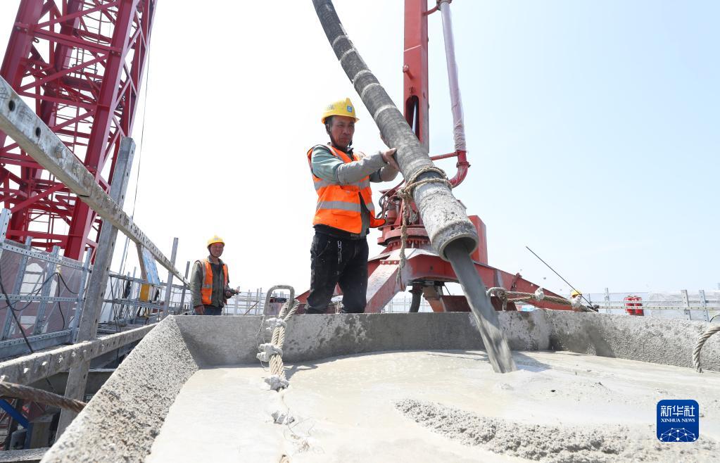 4月27日,工人在臨港西島中銀金融中心項目南塔樓核心筒頂部施工現場(chǎng)進(jìn)行混凝土澆筑前的通泵作業(yè)。