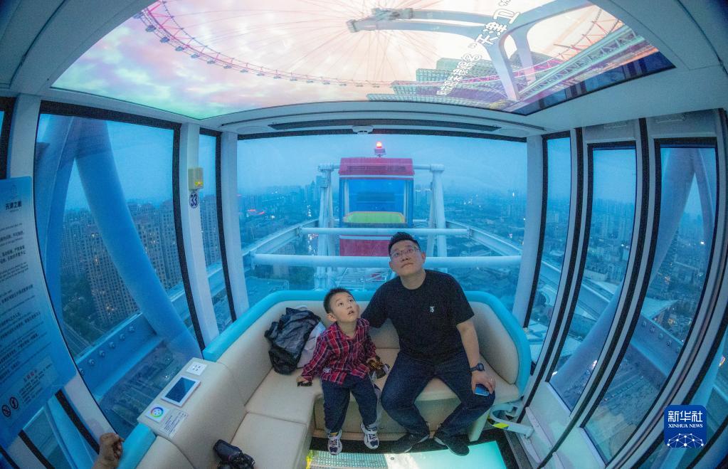 4月27日,游客在乘坐“天津之眼”摩天輪時(shí)觀(guān)看轎廂內新設置的天屏播放的文旅宣傳視頻。
