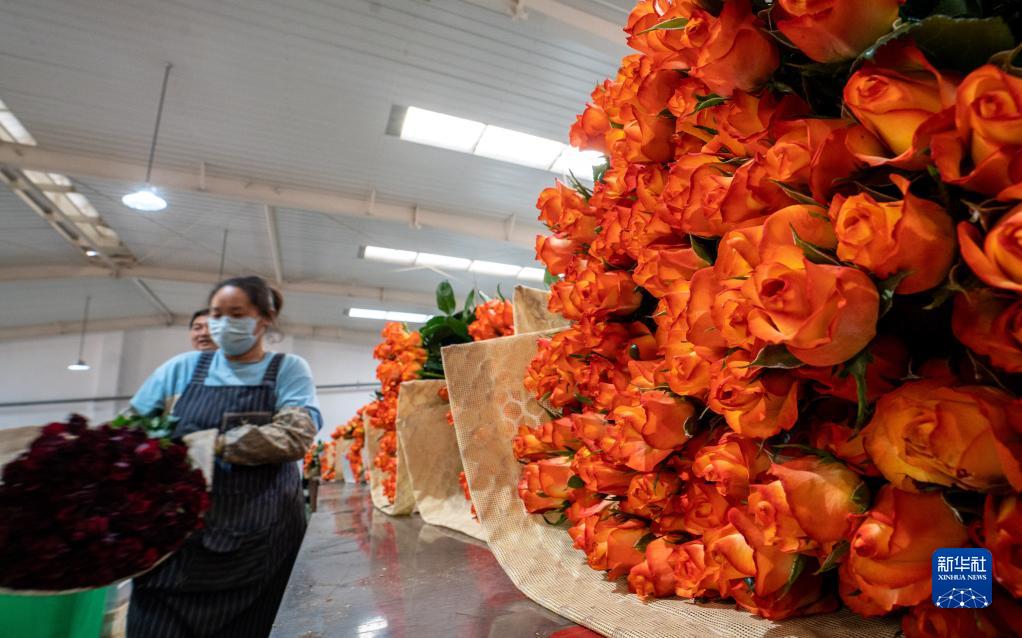 在云南錦科花卉工程研究中心,工人對玫瑰切花進(jìn)行采后處理(4月3日攝)。