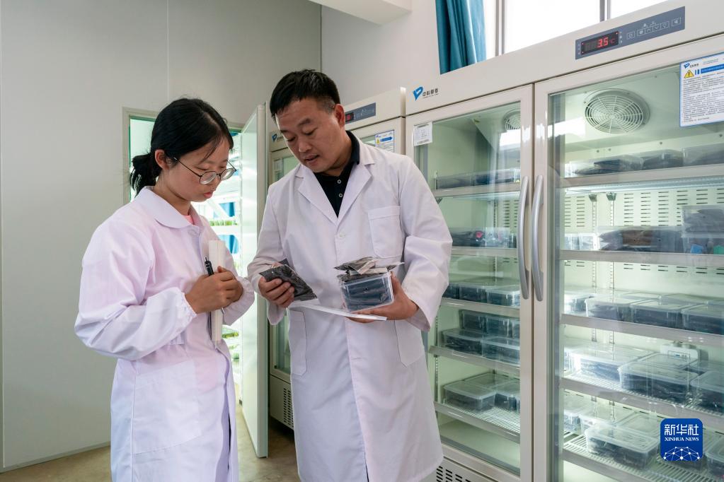 李淑斌(右)和團隊成員在實(shí)驗室內查看營(yíng)養土包裹下的月季種子(4月20日攝)。