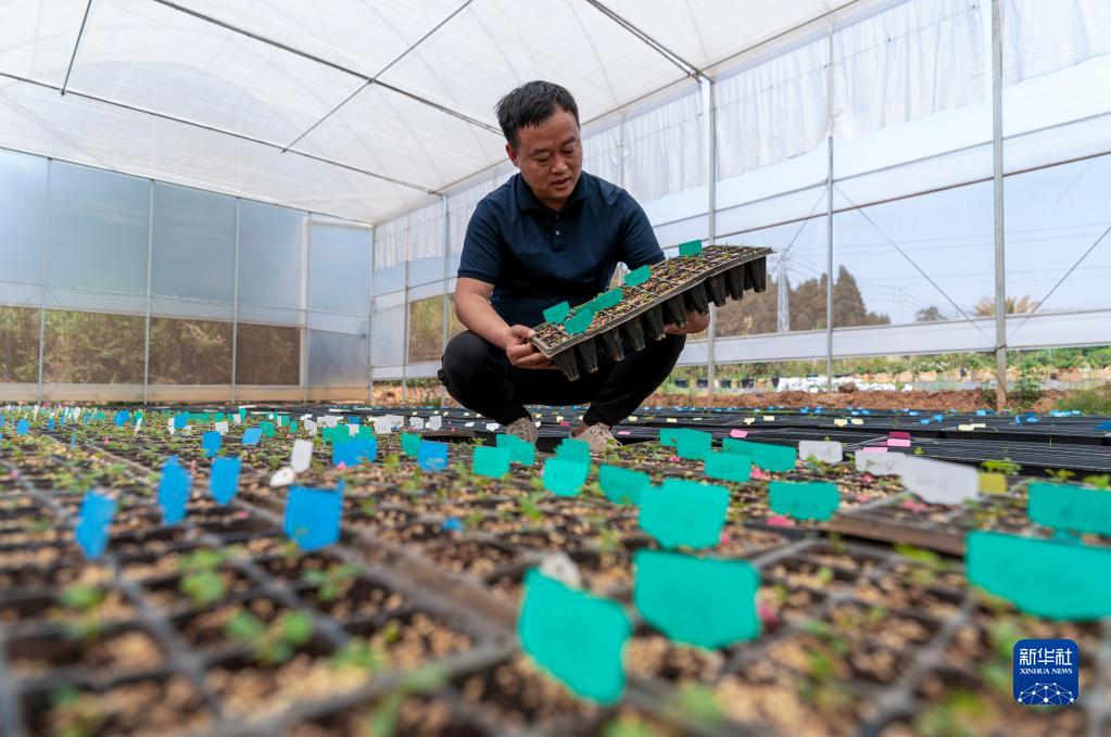 李淑斌在基地大棚內查看月季種子萌發(fā)情況(4月20日攝)。