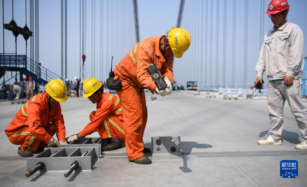 4月28日,在深中通道伶仃洋大橋上,施工人員在完成最后一片箱梁的匹配件安裝。