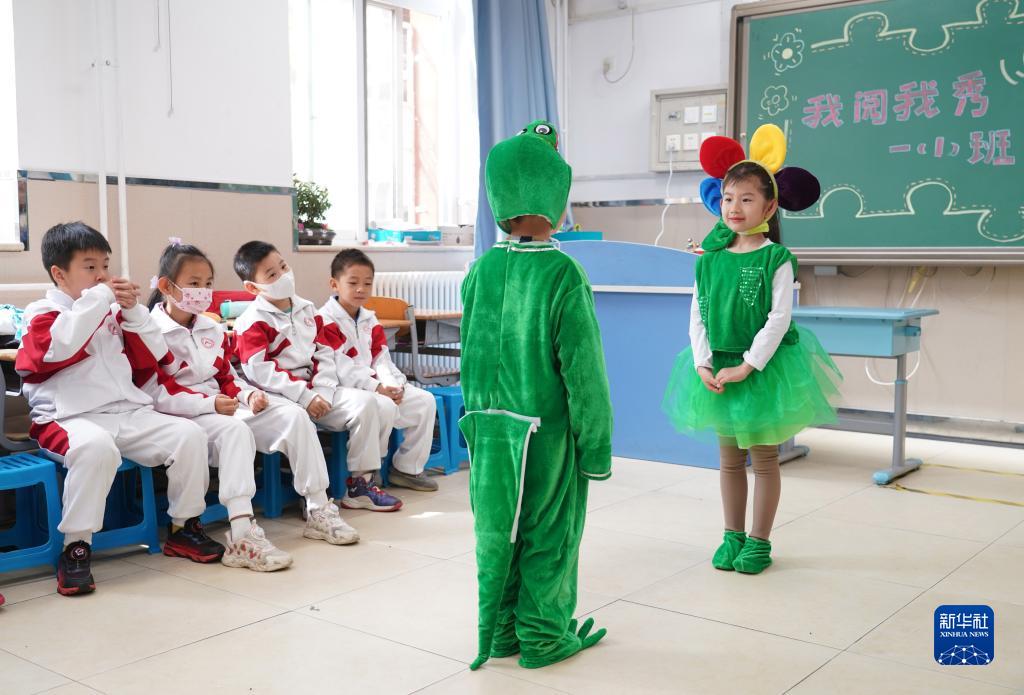 4月28日,在人大附中實(shí)驗小學(xué),一年級(1)班的學(xué)生在活動(dòng)中進(jìn)行戲劇表演。