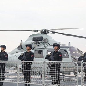 4月28日,中國海軍第44批護航編隊從浙江舟山某軍港解纜起航,隨艦機組、特戰隊員在甲板整齊列隊。