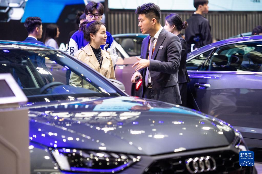4月28日,工作人員(右)向觀(guān)眾介紹參展汽車(chē)。