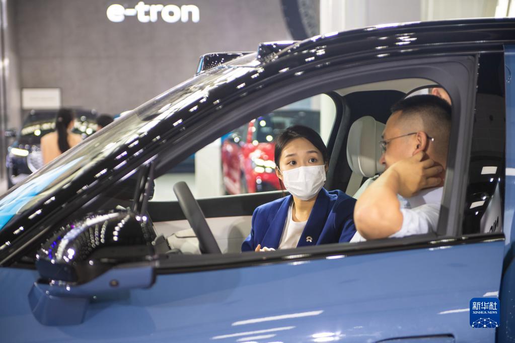 4月28日,工作人員(左)向觀(guān)眾介紹汽車(chē)功能。