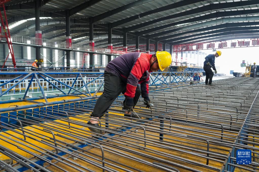 4月28日,工人在黃茅??绾Mǖ乐腔哿簣?chǎng)綁扎鋼筋。