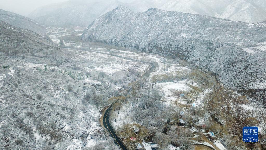 4月28日拍攝的內蒙古自治區呼和浩特市北郊的大青山自然保護區雪景(無(wú)人機照片)。