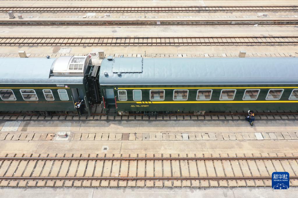 4月28日,中國鐵路上海局集團有限公司徐州站的鐵路連結員在對臨時(shí)旅客列車(chē)進(jìn)行拉風(fēng)作業(yè)(無(wú)人機照片)。