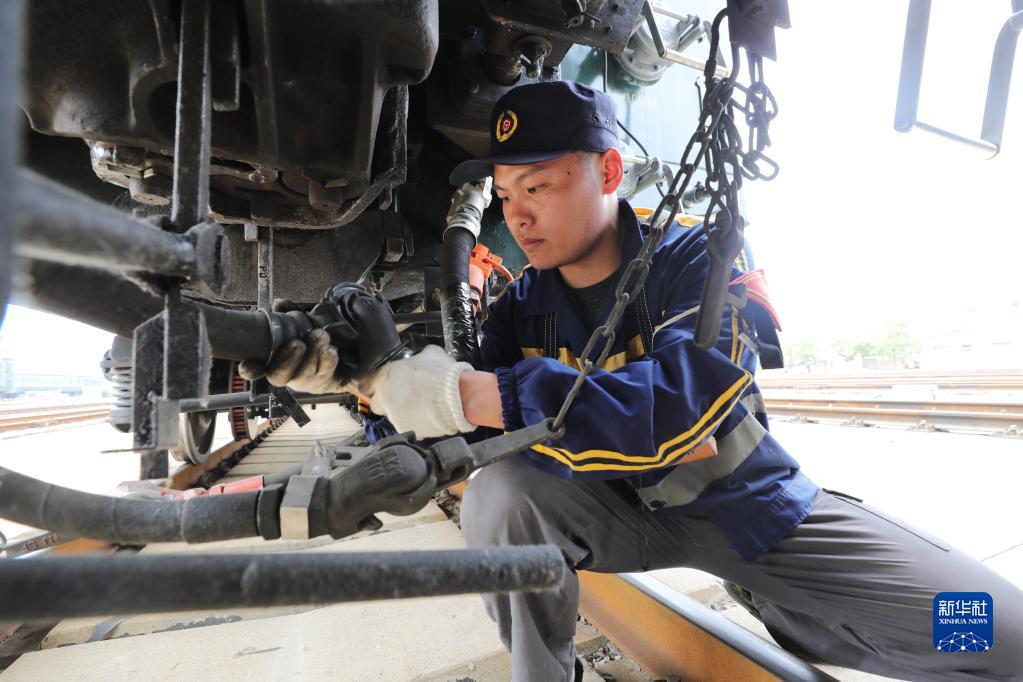 4月28日,中國鐵路上海局集團有限公司徐州站的鐵路連結員在進(jìn)行制動(dòng)軟管摘除作業(yè)。