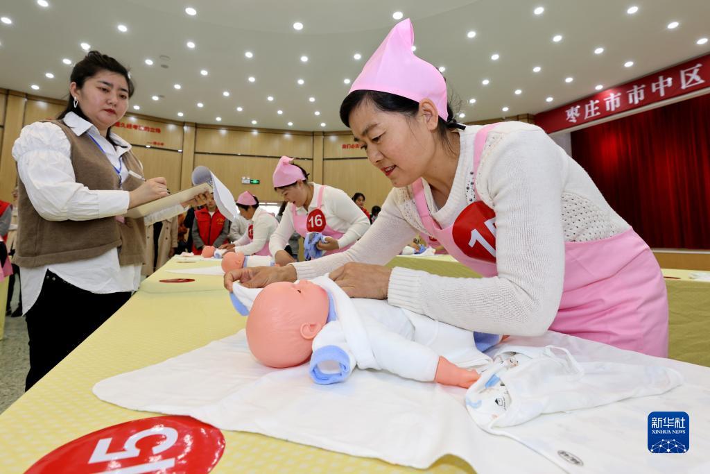 4月27日,在山東省棗莊市市中區總工會(huì ),月嫂進(jìn)行新生兒護理技能比賽。
