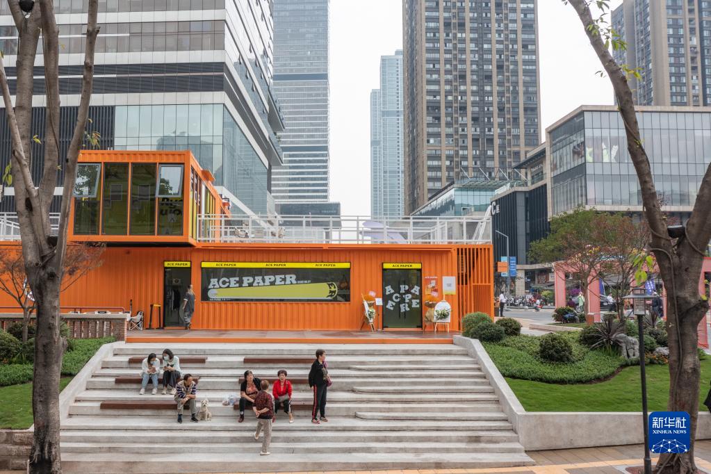 4月28日,在竣工亮相的重慶市九龍坡區謝家灣街道民主村片區城市更新項目(一期),人們在一處公共空間休息(無(wú)人機照片)。