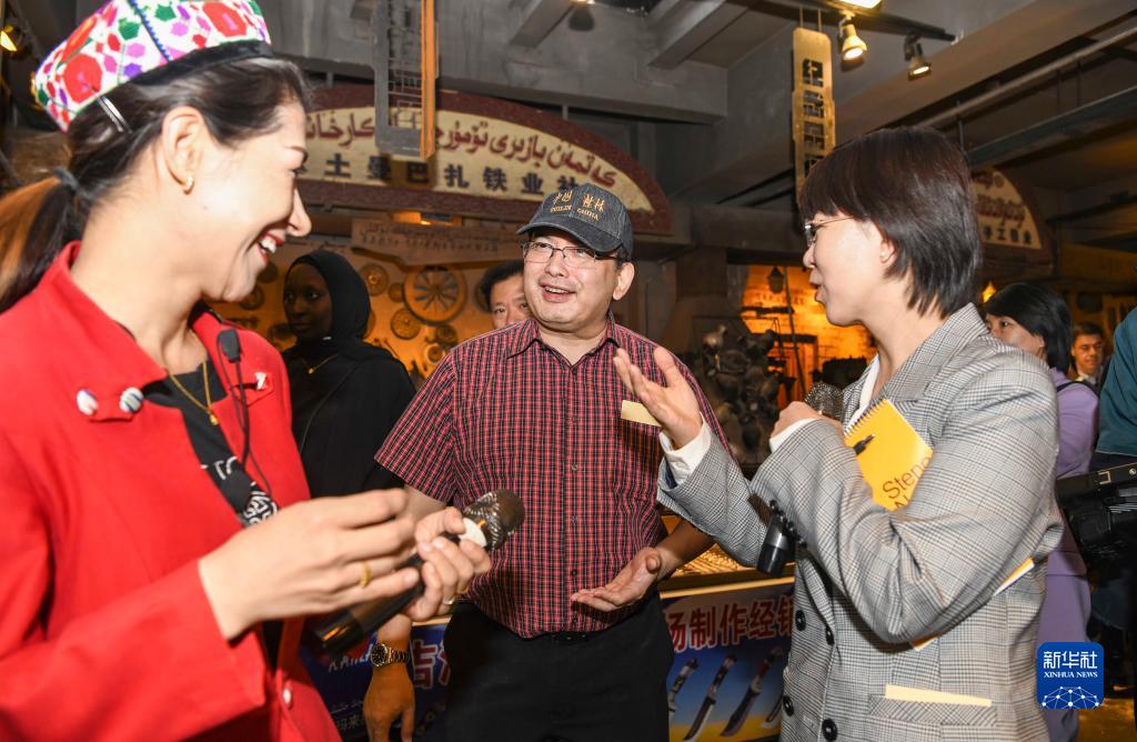 在新疆喀什古城景區鐵匠巴扎,印度尼西亞駐廣州總領(lǐng)事斌德加(中)和喀什當地導游(左)聊天(4月24日攝)。新華社記者 胡虎虎 攝