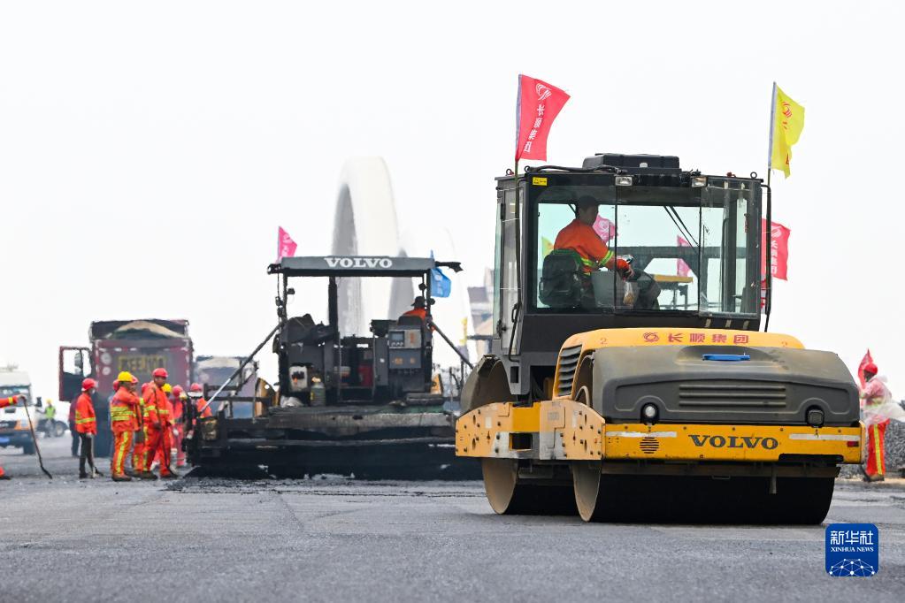 4月29日,建設者在江蘇省昆山市同豐大橋進(jìn)行瀝青攤鋪施工。