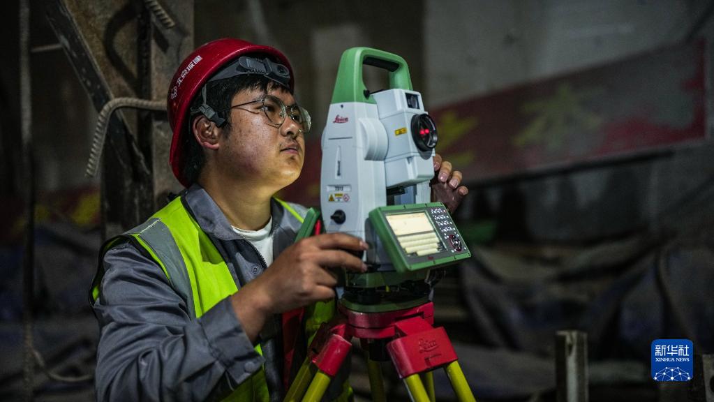 4月29日,技術(shù)人員在貴陽(yáng)地鐵S1線(xiàn)一期工程錦江路站觀(guān)測沉降情況。