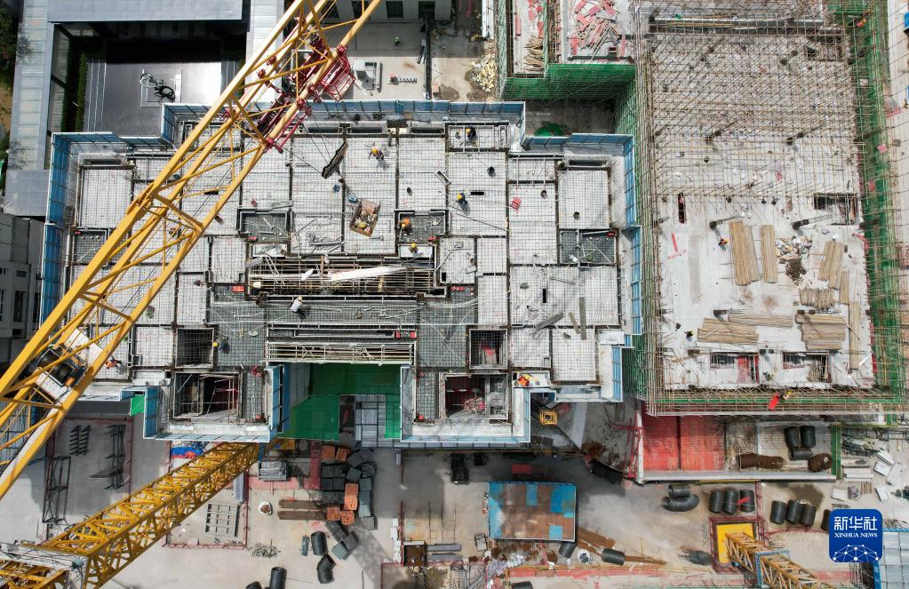 4月29日,工人在合肥林店家園安置房項目工程施工現場(chǎng)忙碌(無(wú)人機照片)。