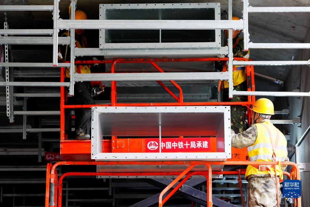 4月29日,在濟南地鐵3號線(xiàn)稻香站,中鐵十局的工作人員在進(jìn)行機電安裝工程排煙系統耐火風(fēng)管安裝作業(yè)。