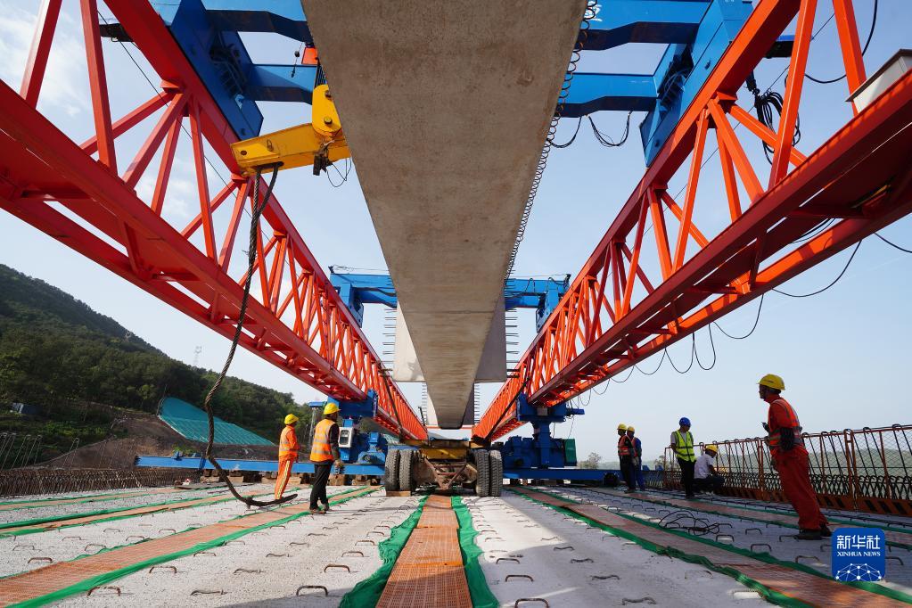 4月29日,在重慶市北碚區渝武高速公路復線(xiàn)項目施家梁立交施工現場(chǎng),中交一公局施工人員在進(jìn)行T梁架設。