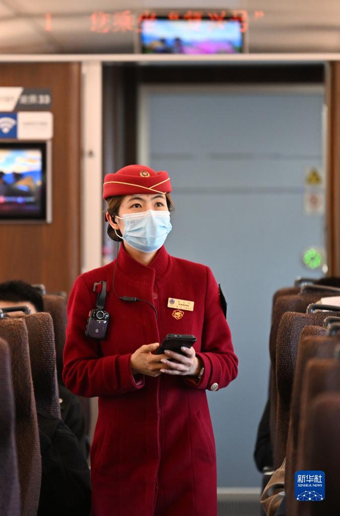 4月29日,京津城際C2569列車(chē)長(cháng)在查看旅客行李擺放情況。