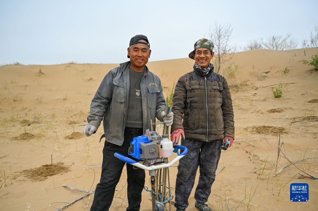 這是治沙客毛福平(左)和老鄉劉金成在內蒙古庫布其沙漠億利生態(tài)治理區中的合影(4月27日攝)。