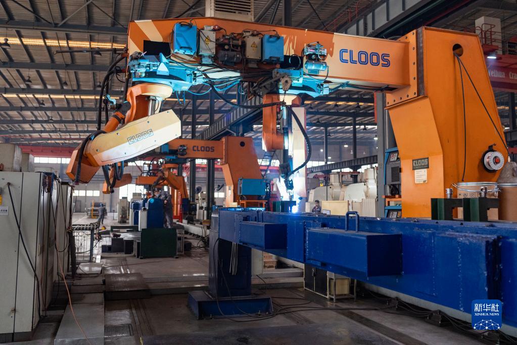 在位于黑龍江省齊齊哈爾市的中車(chē)齊車(chē)公司生產(chǎn)車(chē)間,焊接機器人在自動(dòng)生產(chǎn)作業(yè)(4月19日攝)。