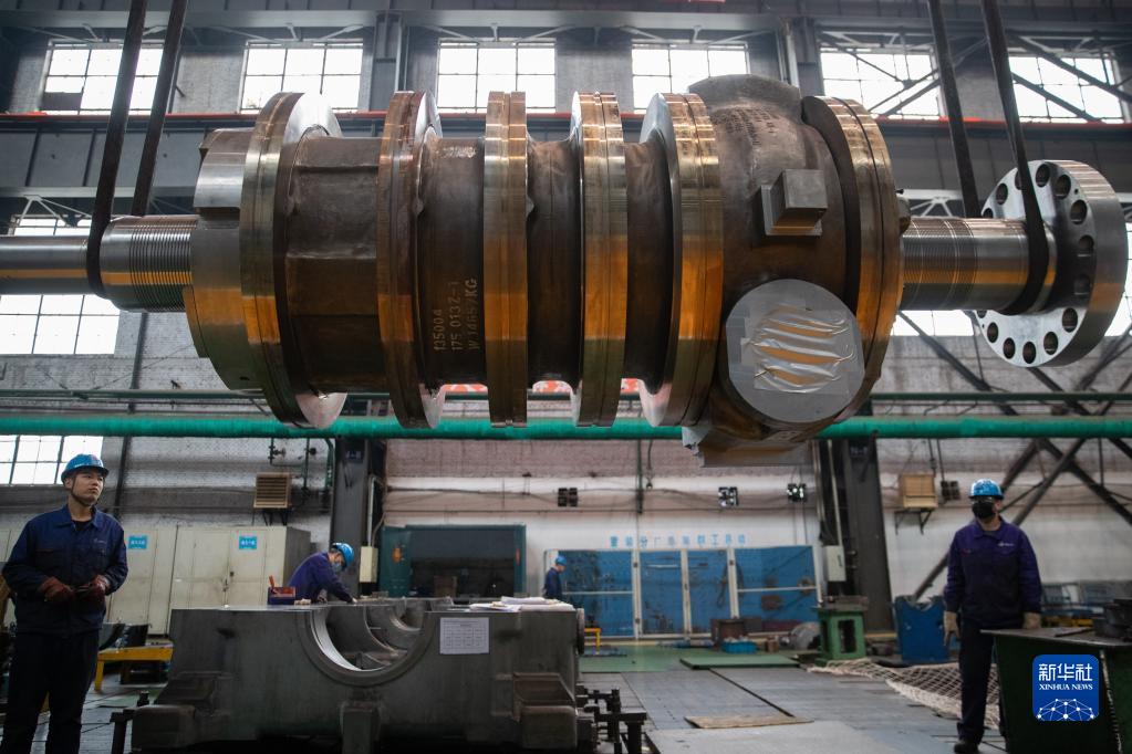 4月28日,工作人員在哈電集團哈爾濱汽輪機廠(chǎng)有限責任公司車(chē)間內準備組裝設備。