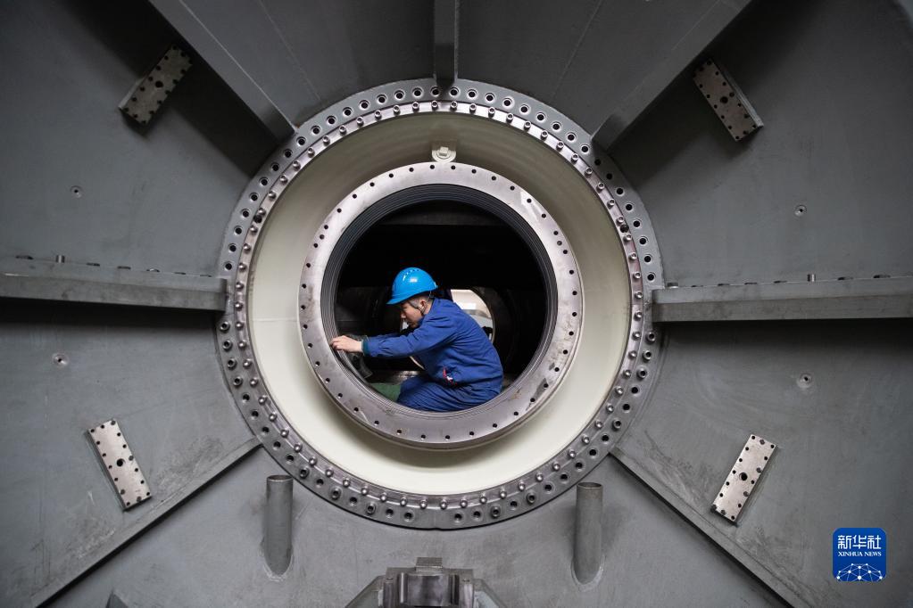4月28日,工作人員在哈電集團哈爾濱汽輪機廠(chǎng)有限責任公司車(chē)間內測量設備尺寸。