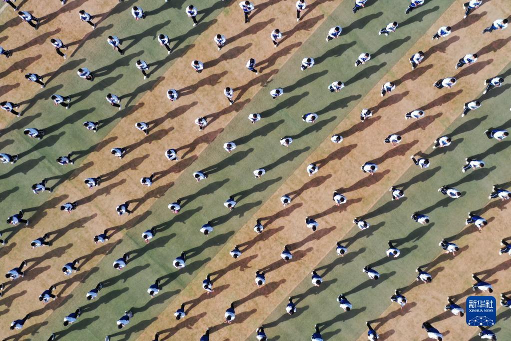 敦煌中學(xué)的學(xué)生在操場(chǎng)上做敦煌舞課間操(4月26日攝,無(wú)人機照片)。