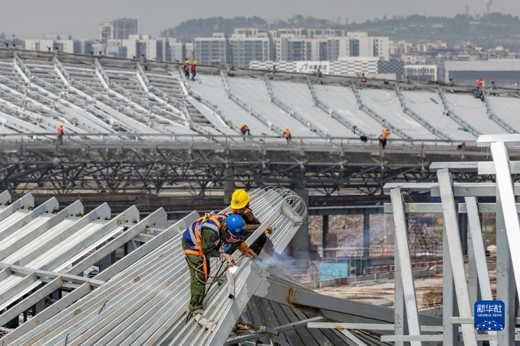 4月29日,工作人員在重慶江北國際機場(chǎng)T3B航站樓施工現場(chǎng)進(jìn)行屋面施工。