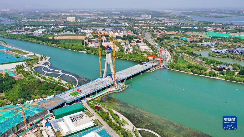 4月29日,石家莊市學(xué)府路東延跨太平河橋主橋實(shí)現合龍(無(wú)人機照片)。