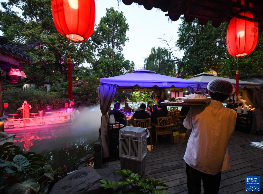 在四川省成都市一家火鍋店內,24歲的傳菜員姚帥在給顧客上菜(2023年4月25日攝)。