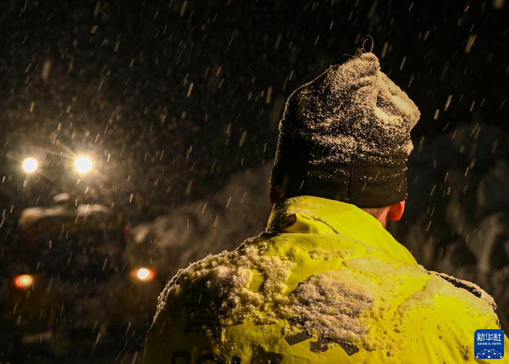 新疆喀納斯景區公安局交警大隊民警馬國軍在一處山路雪崩救援現場(chǎng)工作(2023年1月8日攝)。