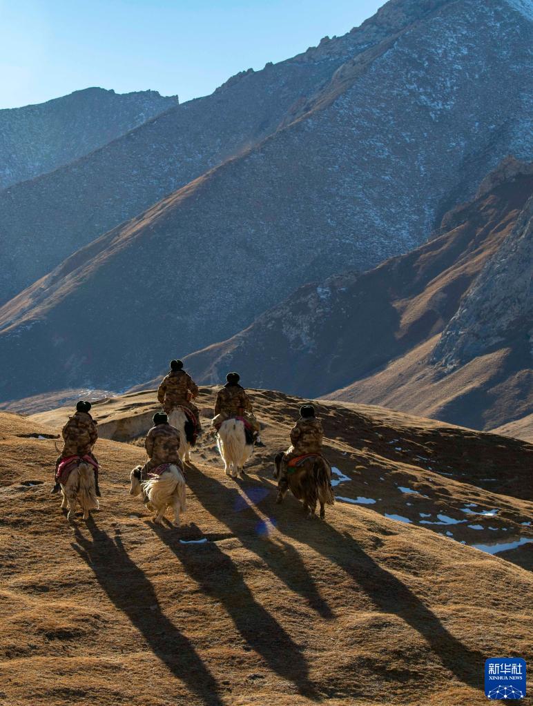 在昆侖山腹地,新疆生產(chǎn)建設兵團第三師圖木舒克市葉城二牧場(chǎng)三連職工騎著(zhù)牦牛行進(jìn)在巡邊路上(2020年12月25日攝)。