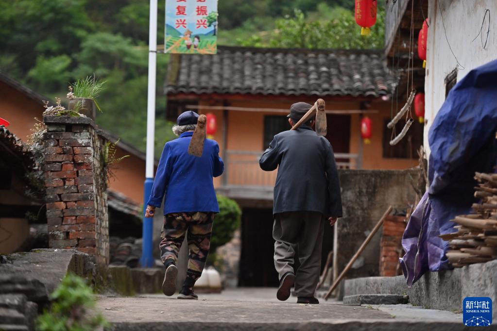 在廣西融安縣東起鄉崖腳村銅板屯,85歲龍顯星(右)和老伴勞作歸來(lái)(2023年4月24日攝)。