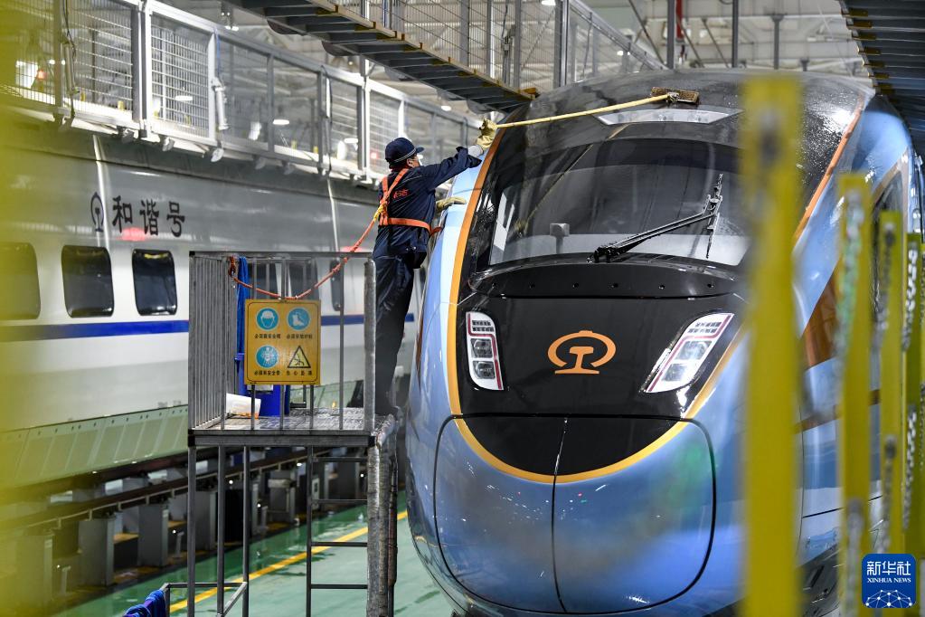 保潔人員在蘭州車(chē)輛段銀川動(dòng)車(chē)運用所清洗動(dòng)車(chē)(2021年3月19日攝)。