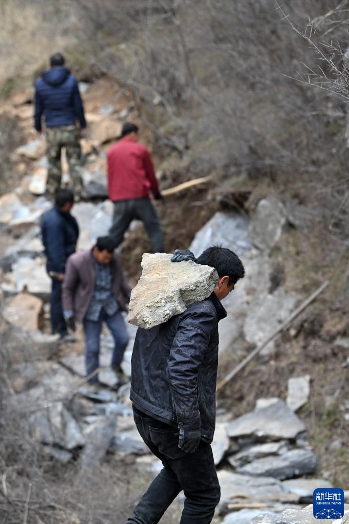 在山西省壺關(guān)縣大峽谷鎮青龍峽村,村民在修路現場(chǎng)搬運石頭(2023年3月23日攝)。