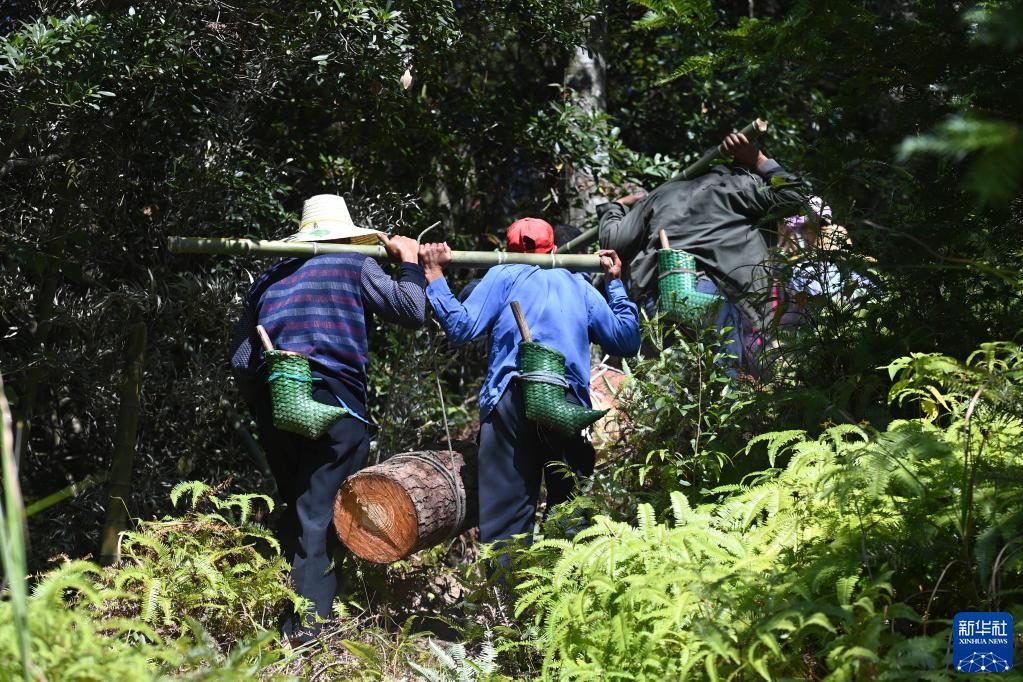 廣西融水苗族自治縣桿洞鄉烏英苗寨群眾在合力抬木頭,準備建設村中設施(2022年11月3日攝)。