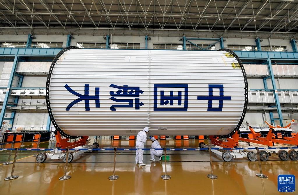 在航天科技集團一院天津火箭公司總裝測試車(chē)間,裝配一組班組成員在進(jìn)行火箭裝配(2023年4月19日攝)。