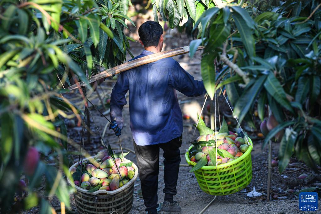 在海南省三亞市育才生態(tài)區芒果園,農民在轉運采收的芒果(2023年2月1日攝)。