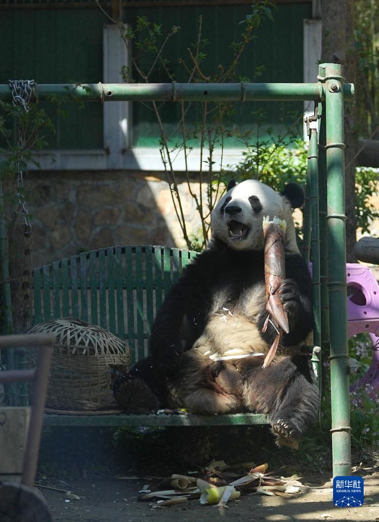 4月30日,在北京動(dòng)物園大熊貓館,大熊貓“萌蘭”在吃竹筍。