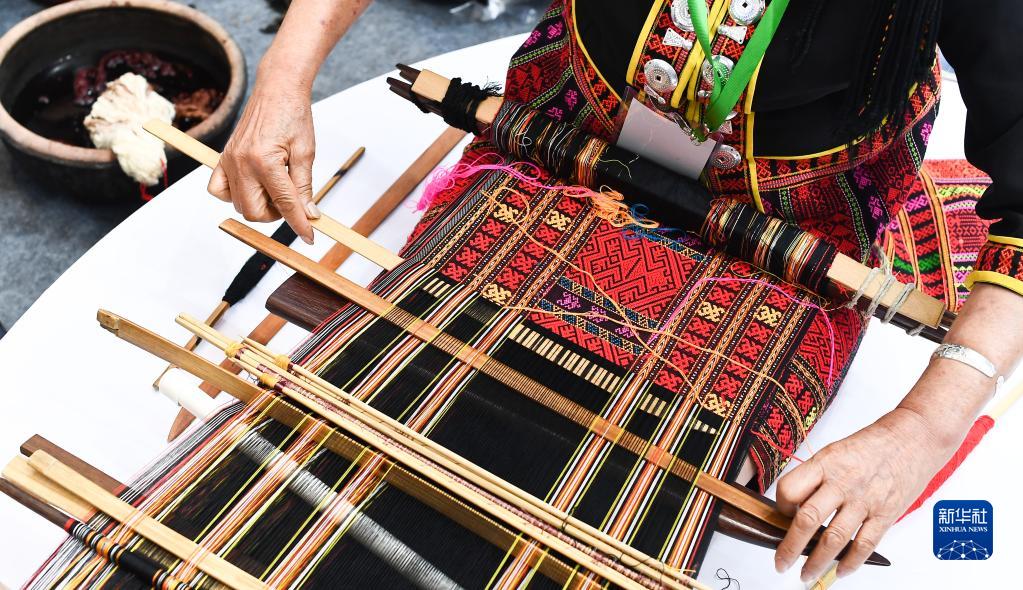 4月30日,在2023海南錦繡世界文化周非物質(zhì)文化遺產(chǎn)傳統織繡印染技藝項目精品展上,手工藝人正在編織黎錦。