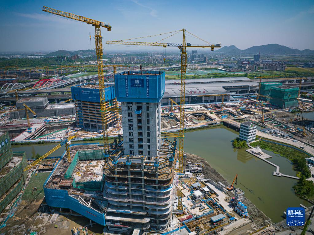 4月30日在浙江紹興拍攝的中建三局紹興北站TOD綜合交通樞紐工程建設現場(chǎng)(無(wú)人機照片)。