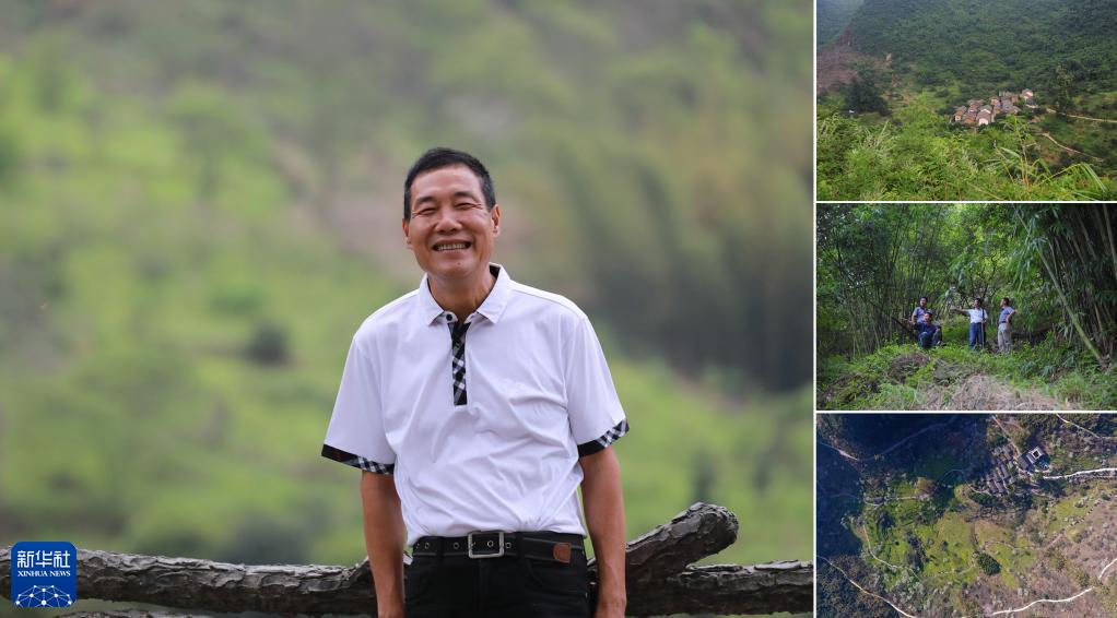 拼版照片:左圖為廣西融安縣東起鄉銅板屯60歲的村民龍飛任(2022年3月20日攝);右上圖為2012年10月21日拍攝的銅板屯;右中圖為龍飛任(左一)和村民們在山上規劃銅板屯的發(fā)展(2013年6月19日攝);右下圖為2019年3月3日無(wú)人機拍攝的銅板屯。