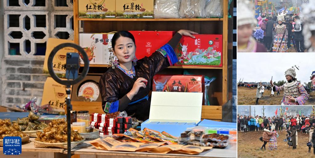 拼版照片:左圖為“90后”苗族姑娘賈宥凌在廣西融水苗族自治縣夢(mèng)嗚苗寨的工作室直播帶貨(2023年4月24日攝);右上、中、下圖為賈宥凌在坡會(huì )上做直播(2023年2月6日攝)。